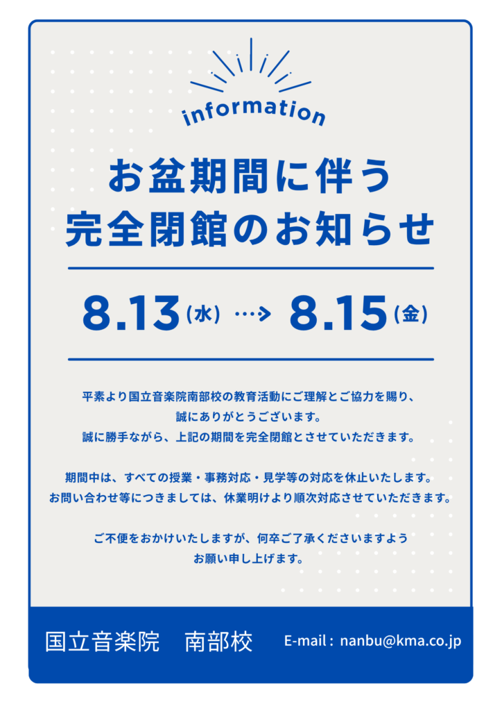 8/13(水)から8/15(金)の期間は、お盆期間のため完全閉館いたします。